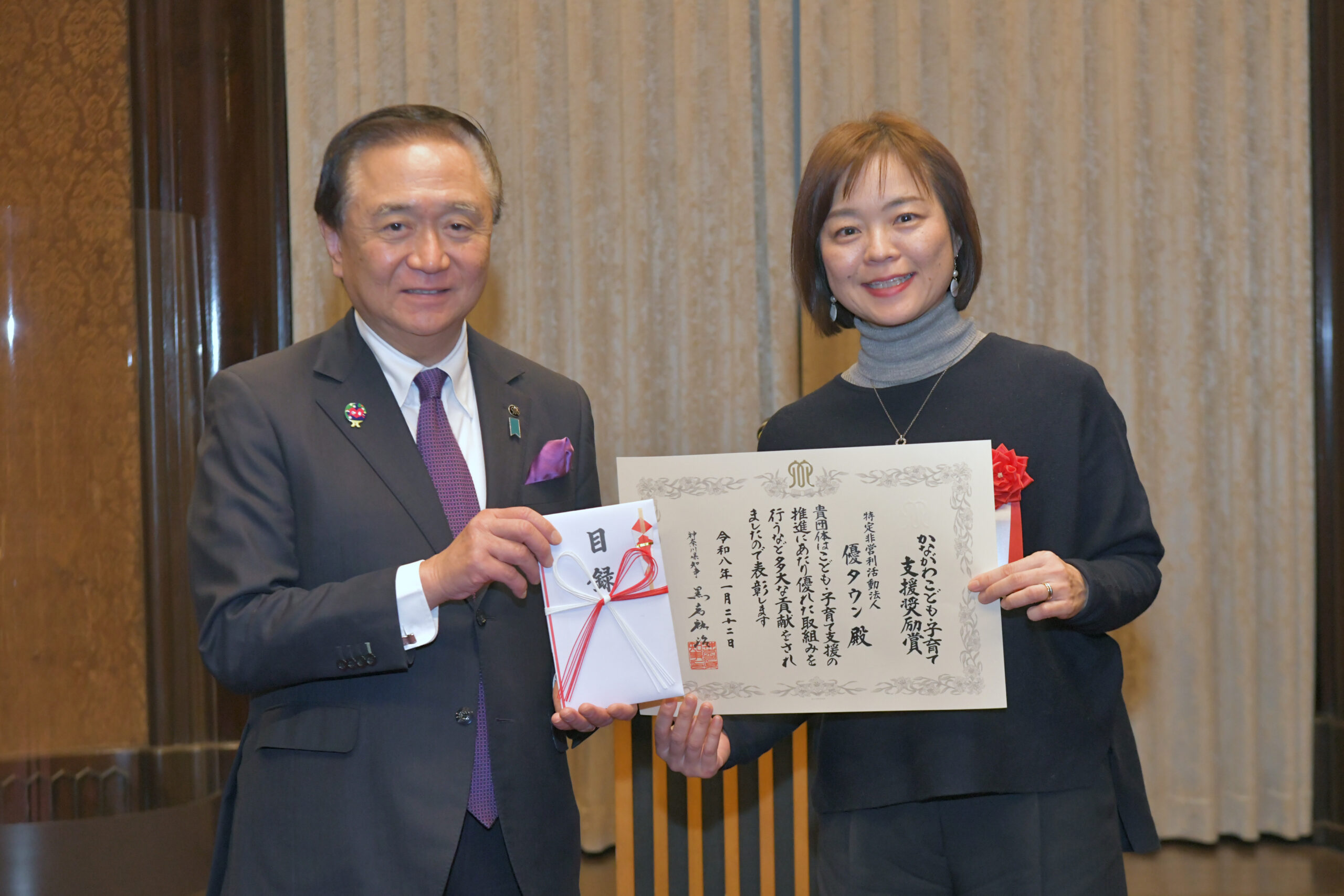 授賞式は、2026年1月22日に開催され、県内で子ども・子育て支援に取り組む団体の皆さまとともに出席いたしました。式典では、各団体の取り組みが紹介され、地域における支援活動の広がりとその意義を改めて実感する機会となりました。