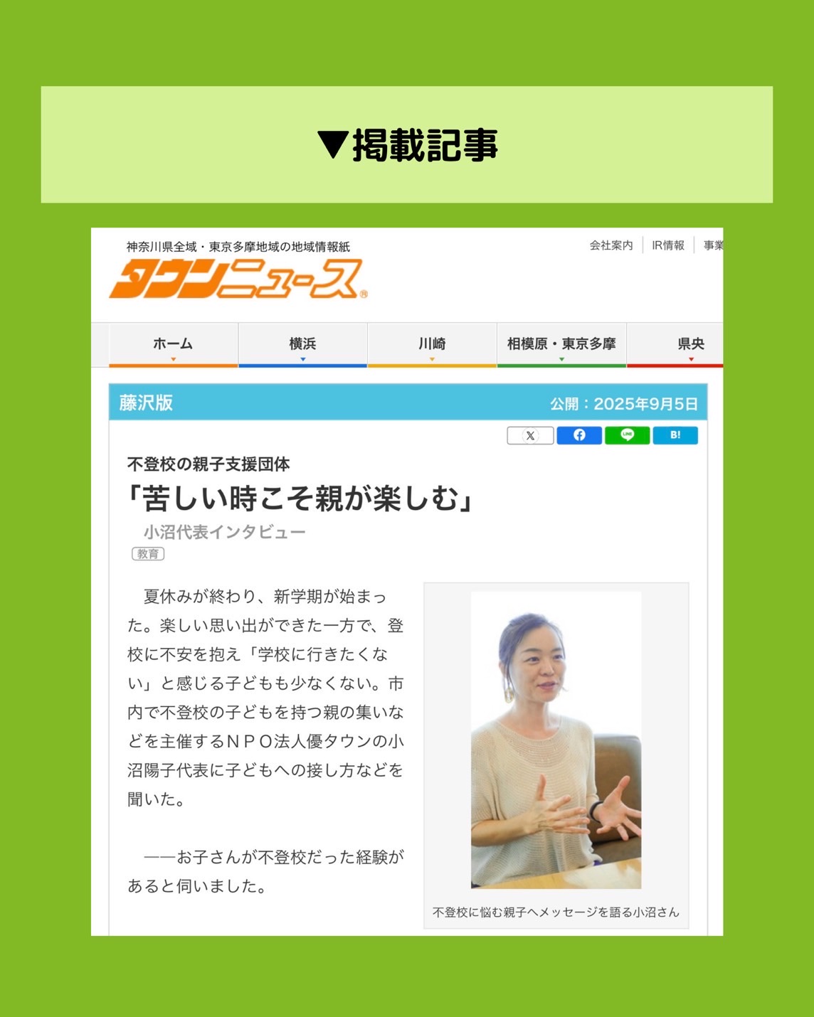 このたび、当法人代表・小沼陽子が、2025年9月5日号 タウンニュース藤沢版の記事「不登校の親子支援団体 “苦しい時こそ親が楽しむ”」にてインタビューを受け、掲載されました。